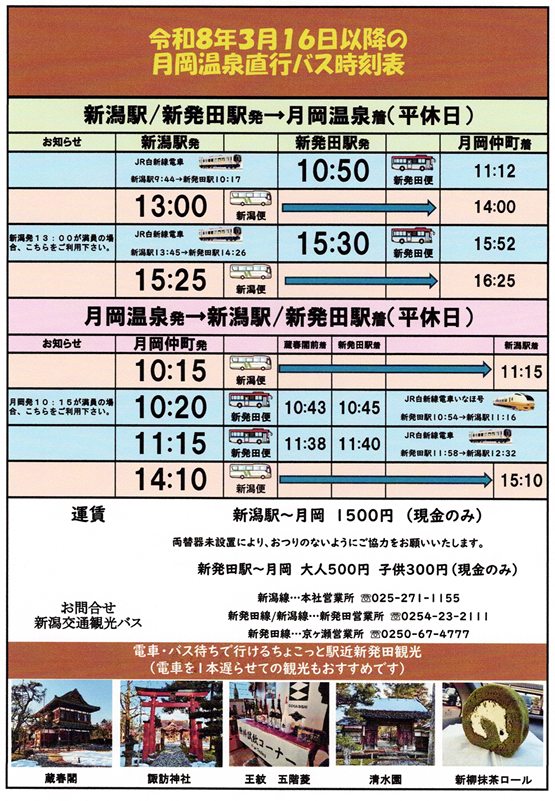 バス時刻の変更について 2026.01.31 2026年3月16日より、月岡温泉直行バスの時刻が変更となります。 詳細は月岡温泉観光案内のアクセスページをご参照ください。 https://www.tsukiokaonsen.gr.jp/access/