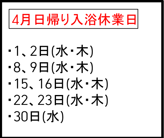 2026年4月の日帰り入浴休業日 2026.03.27 2026年4月の日帰り入浴休業日は ・1、2日(水・木曜日) ・8、9日(水・木曜日) ・15、16日(水・木曜日) ・22、23日(水・木曜日) ・30日(水曜日) となっております。